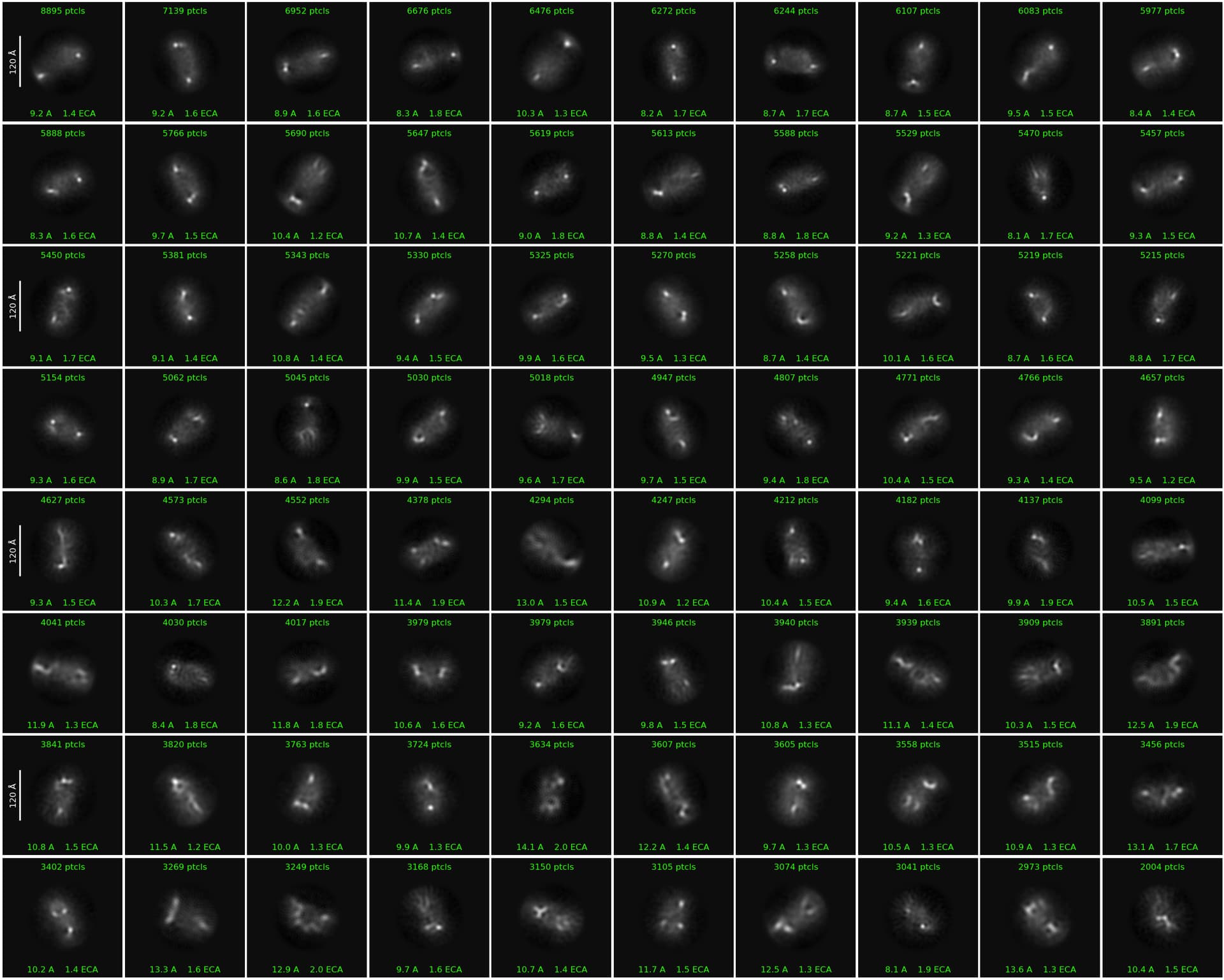 When running 2D classification in Cryopsarc, most 2D class averages consistently show two bright dots at opposite ends of the particles, which likely correspond to the RNA molecules. However, the central protein region appears weak and poorly aligned, resulting in unclear 2D features.