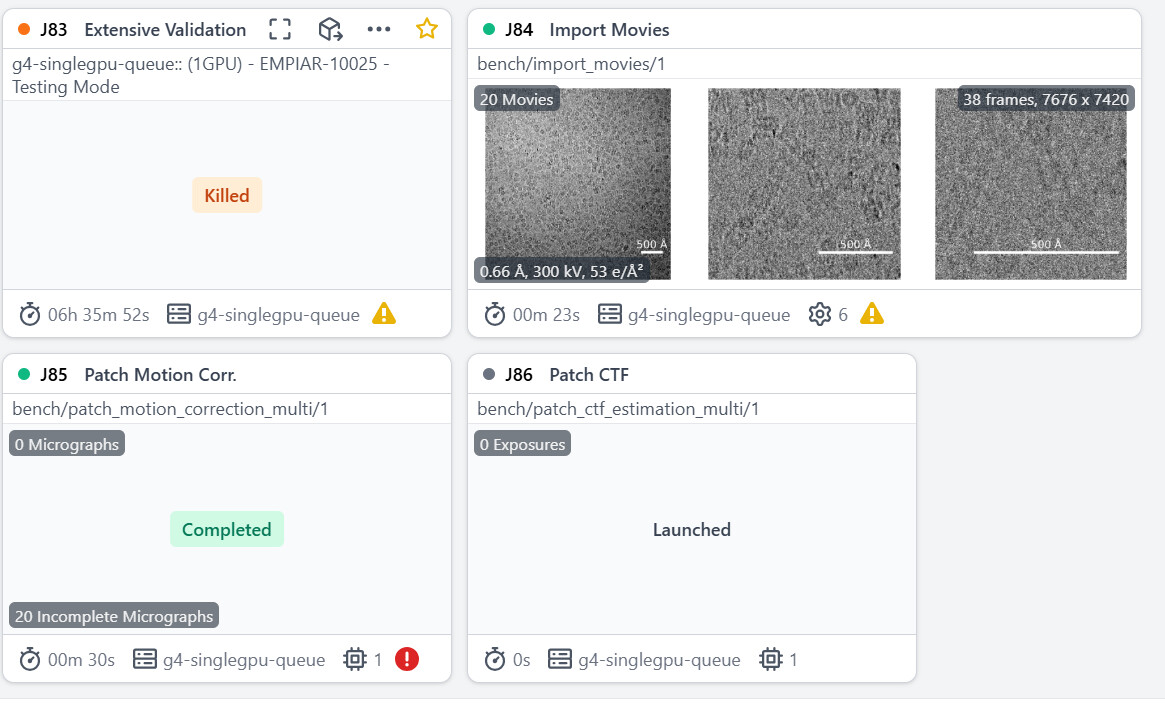 , ‘custom_vars’: {}, ‘desc’: None, ‘hostname’: ‘g4-singlegpu-queue’, ‘lane’: ‘g4-singlegpu-queue’, ‘name’: ‘g4-singlegpu-queue’, ‘qdel_cmd_tpl’: ‘/opt/aws/pcs/scheduler/slurm-25.05/bin/scancel {{ cluster_job_id }}’, ‘qinfo_cmd_tpl’: ‘/opt/aws/pcs/scheduler/slurm-25.05/bin/sinfo’, ‘qstat_cmd_tpl’: ‘/opt/aws/pcs/scheduler/slurm-25.05/bin/squeue -j {{ cluster_job_id }}’, ‘qstat_code_cmd_tpl’: None, ‘qsub_cmd_tpl’: ‘/opt/aws/pcs/scheduler/slurm-25.05/bin/sbatch {{ script_path_abs }}’,‘script_tpl’: ‘#!/usr/bin/env bash\n#SBATCH --job-name cryosparc_{{ project_uid }}_{{ job_uid }}\n#SBATCH --cpus-per-task={{ num_cpu }}\n#SBATCH -N 1\n#SBATCH --mem={{ (ram_gb)|int }}G\n#SBATCH -o {{ job_dir_abs }}/slurm-%j.out\n#SBATCH -e {{ job_dir_abs }}/slurm-%j.err\n#SBATCH --exclusive --partition=g4-singlegpu\n#SBATCH --gres=gpu:1\n#SBATCH --constraint=“g4dn-4xlarge-node”\n\nexport PATH=/opt/aws/pcs/scheduler/slurm-25.05/bin:$PATH\nexport LD_LIBRARY_PATH=/lib64:/usr/lib64\nunset CUDA_HOME\nunset CUDA_PATH\nunset CUDA_ROOT\nunset CUDA_VISIBLE_DEVICES\nexport PYTHONIOENCODING=UTF-8\nexport PYTHONUTF8=1\nexport CRYOSPARC_CACHE_DIR=/scratch\nexport NUMBA_CUDA_USE_NVIDIA_BINDING=0\nexport NUMBA_CUDA_DRIVER=/lib64/libcuda.so.1\nexport CUDA_DEVICE_ORDER=PCI_BUS_ID\n\nif [ -n “$SLURM_JOB_GPUS” ]; then\n export CUDA_VISIBLE_DEVICES=$SLURM_JOB_GPUS\nelif [ -n “$SLURM_STEP_GPUS” ]; then\n export CUDA_VISIBLE_DEVICES=$SLURM_STEP_GPUS\nfi\n\necho “CUDA_VISIBLE_DEVICES=(hostname)”\nnvidia-smi || echo “nvidia-smi failed”\nldconfig -p | grep libcuda || echo “libcuda not found”\n\n{{ run_cmd }}\n’, ‘send_cmd_tpl’: ‘{{ command }}’, ‘title’: ‘g4-singlegpu-queue’, ‘tpl_vars’: [‘job_uid’, ‘run_cmd’, ‘command’, ‘ram_gb’, ‘job_dir_abs’, ‘cluster_job_id’, ‘project_uid’, ‘num_cpu’], ‘type’: ‘cluster’, ‘worker_bin_path’: ‘/efshome/apps/cryosparc/apps/v4.7.1_251124/cryosparc_worker/bin/cryosparcw’}}