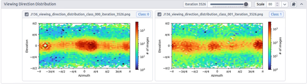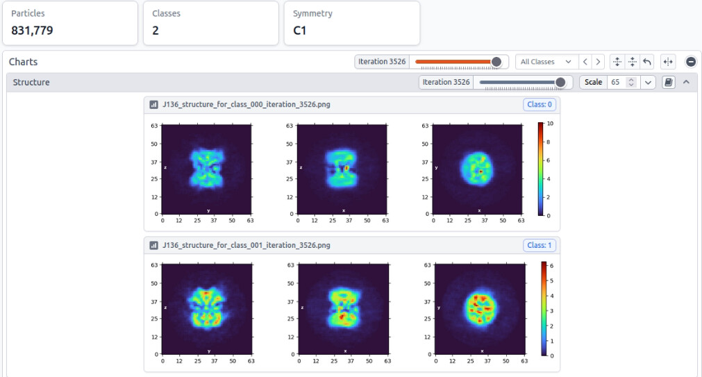 Using these particles, I again performed a two-class ab initio reconstruction followed by NU refinement. However, I obtained essentially the same result, with a distorted (stretched/compressed) map. I also performed 3D classification, however, it did not lead to any improvement