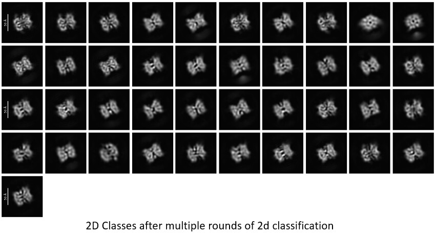 I performed motion correction, CTF estimation, and micrograph denoising. I initially carried out blob picking (60–80 Å) on a few micrographs, followed by particle extraction (192 px box size, Fourier-cropped to 48 px). After 2D classification, I used the good-looking classes for template-based picking across the entire dataset. I then removed junk particles through several rounds of 2D classification.