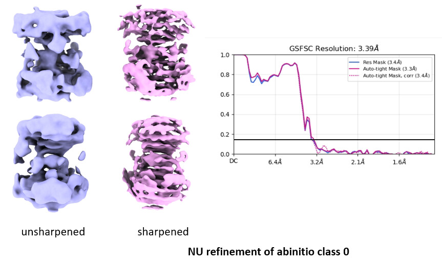 very helpful info. thanks. did you try D2 symmetry during any step? If you are using ab initio result as input reference for NU-refine, then it just seems like it’s having a hard time with maximization and building a better structure. could you use a published streptavidin reference (generally I wouldn’t do this) or apply symmetry if it exists to eliminate distortion such that NU-refine will more appropriately assign particles, enabling better maximization?