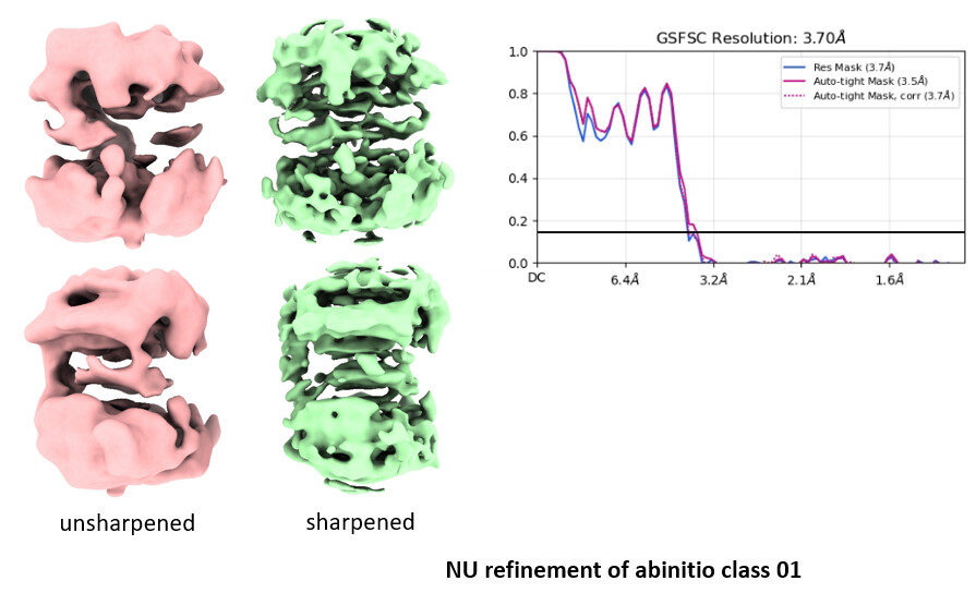 Both the abinitio model were refined independently (after re-extracting with box size 196 px) using NU refinement (default settings except dynamic mask was kept off).