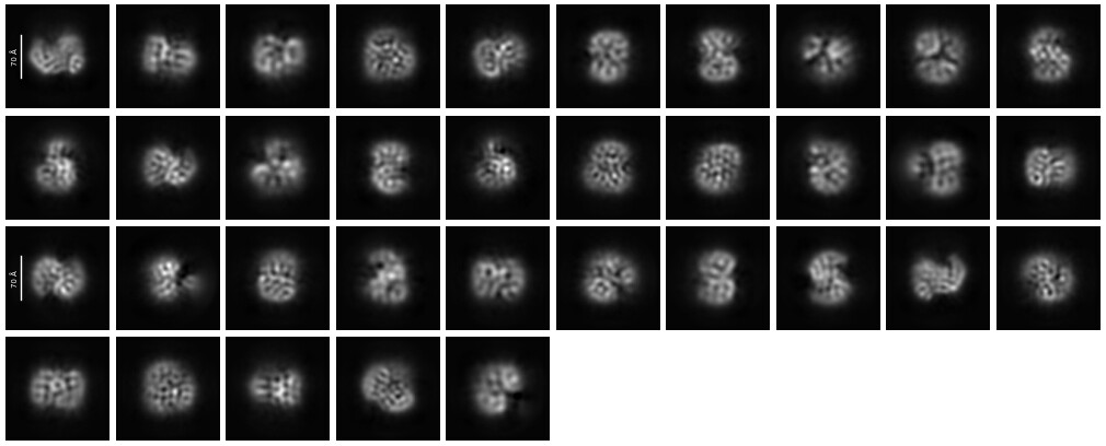 First round of 2D classification with purely manually picked particles which showed promising 3-domain classes (2,344):