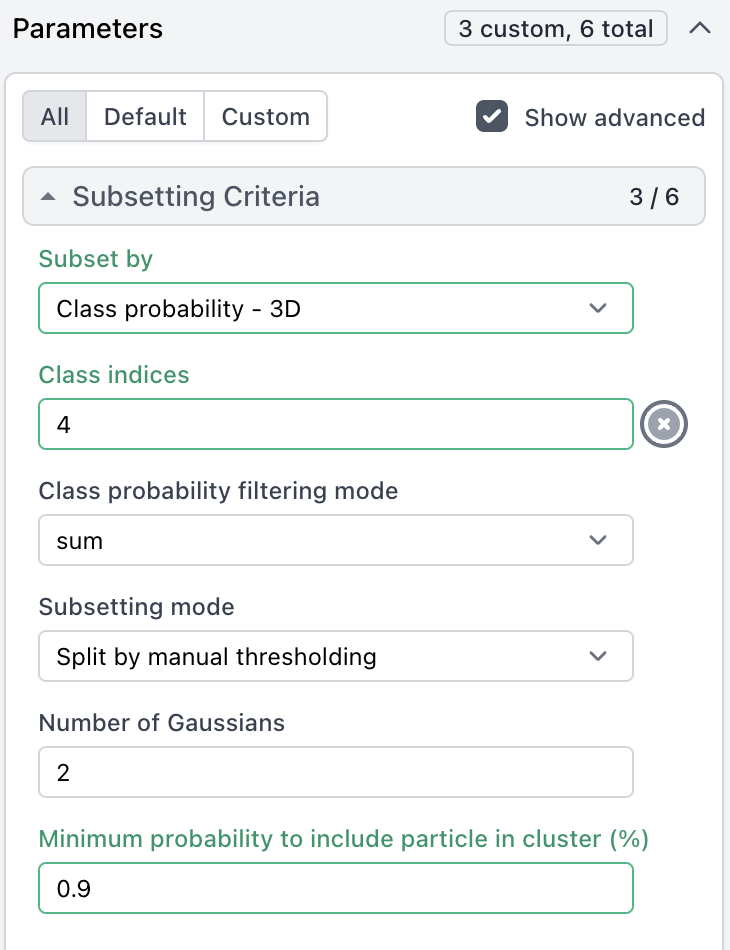 @DanielAsarnow Iâve been able to get it to work, but it is a bit finicky with the GUI. Specifically, after changing âSubset byâ to âClass Probability - 3Dâ I need to reset the âSubsetting modeâ back to Gaussian fitting, and then selecting manual threshold. When it works, the âClass indicesâ and âThresholdâ options turn green to indicate custom parameters. After this workaround it runs properly with pre-patch Heterogenous Refinement jobs, but I still see error message Oli posted originally.
