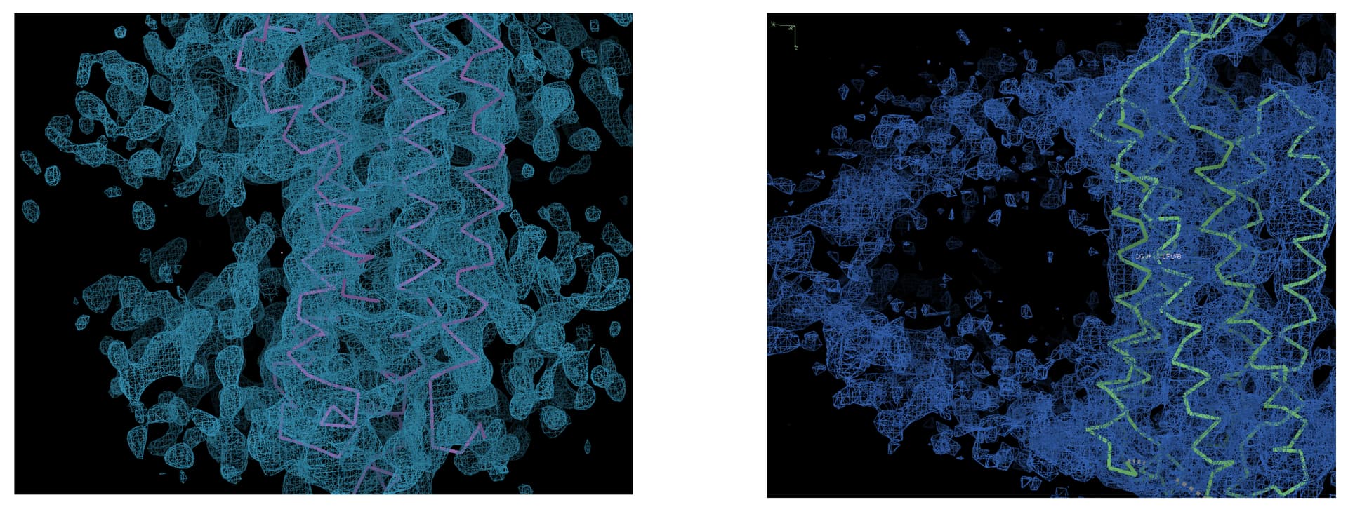 The two figures on the left and right show the transmembrane helix domain models and cryo-EM maps of two members from the same membrane protein family. The map on the left is the result of a local refinement in cryoSPARC targeting the transmembrane region, with a resolution of 3.9 Å. The map on the right is a composite map generated from cryoSPARC’s non-uniform refinement and local refinement, with the transmembrane region at a resolution of 4.3 Å, and it has been publicly published.