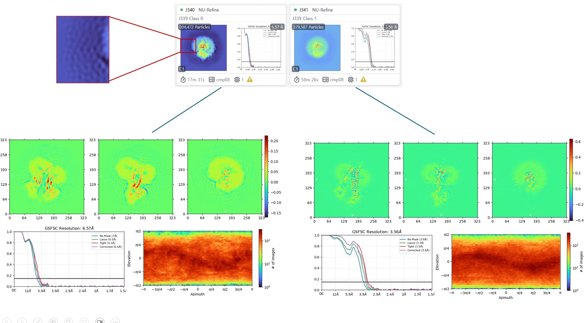 My sample is a membrane protein. After hetero-refinement, I obtained two non-uniform refinement classes (J340 and J341), which seem to differ due to structural heterogeneity—particularly the presence of a flexible two-helix region.