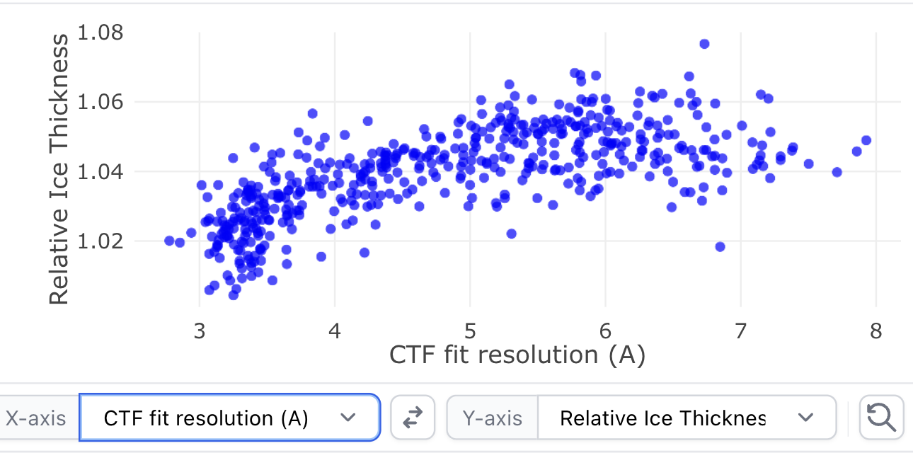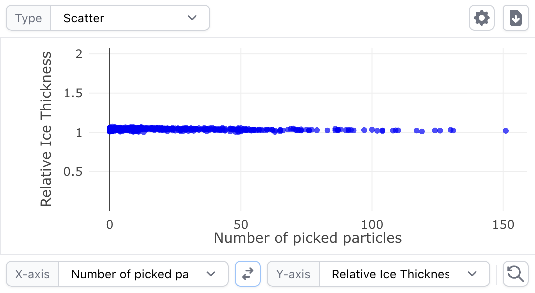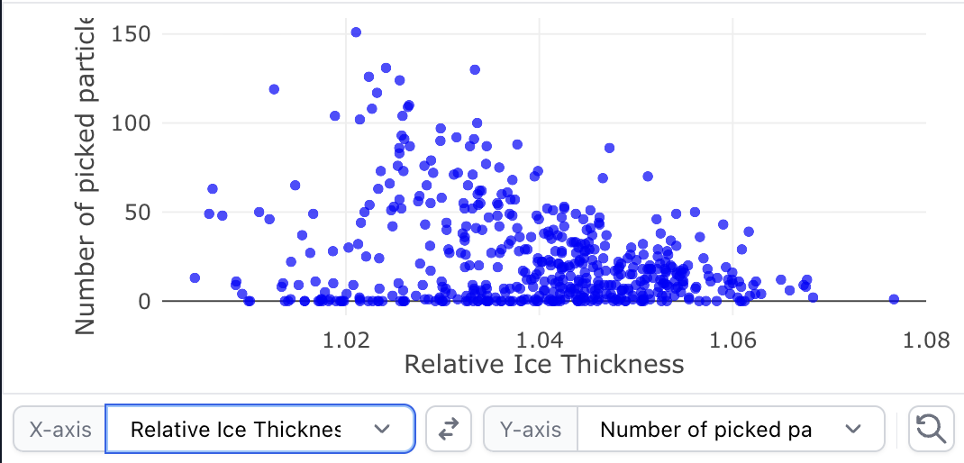 There seems to be a (very!) minor bug in plotting bug in Curate Micrographs, which manifests specifically when the number of picked particles is plotted on the x axis, and relative ice thickness is on the y-axis: