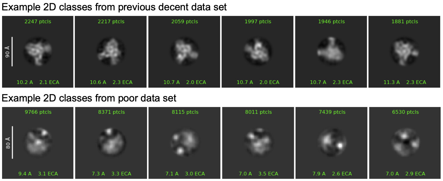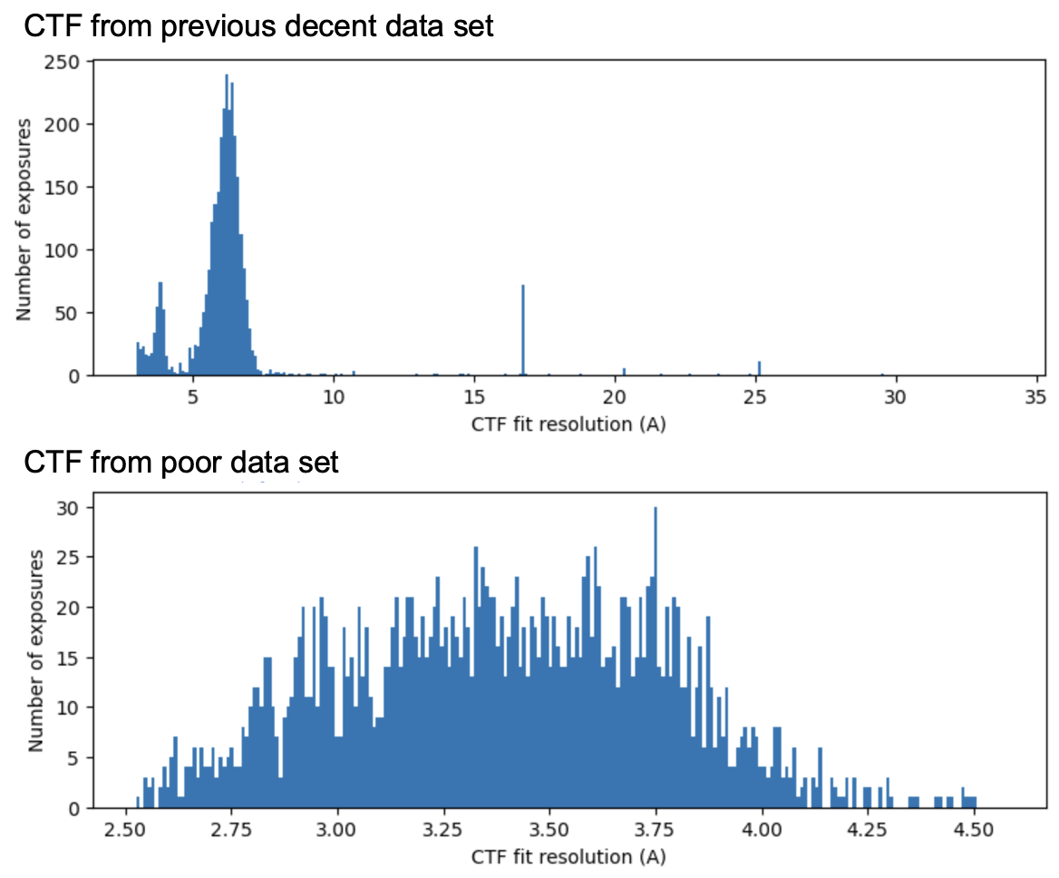 Below is a comparison of a previous data set that gave me a ~4.7Å volume, collected on a Glacios with Gatan K3 detector, and my recent poor data set, collected on a Krios with an Falcon 4i detector.