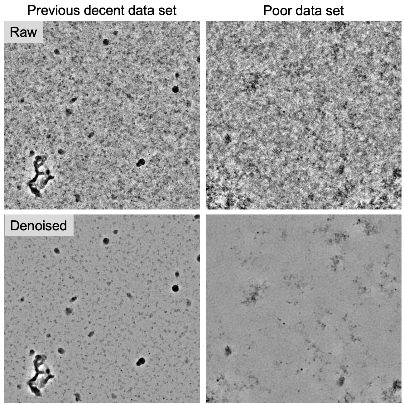 Note: we often see poor contrast in the protein and high contrast from the duplex RNA component of the particles, so it seems plausible that denoising could lead to me not being able to see the particles.