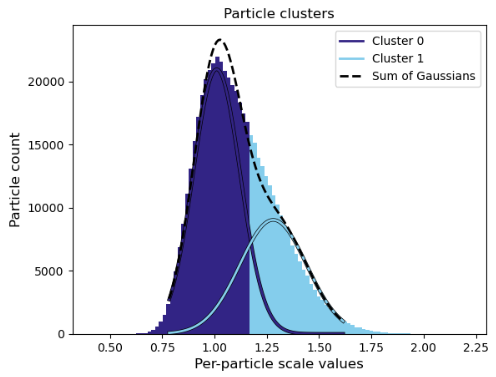 My intention was to process each Gaussian separately. At that point, I had already upgraded to CryoSPARC v5. When I select “Particles (all classes)” from the 3D Classification job as input and run Subset by Statistic using the statistic “per-particle scale (optimal)”, I obtain the following distribution: