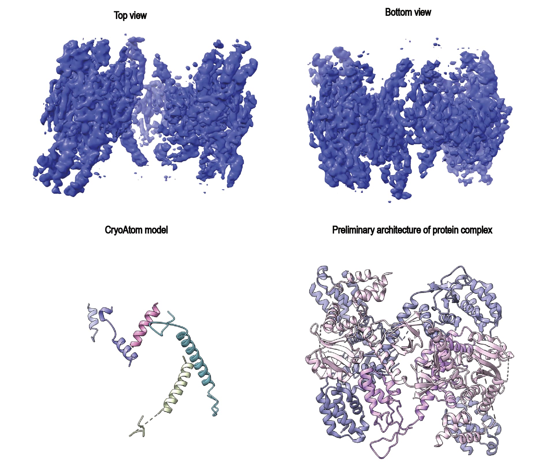 The core of our complex is about 120 Å in diameter and consists of a tetramer of one protein, along with up to four molecules of another protein. After 2D classification and ab-initio reconstruction, we performed particle cleanup, resulting in ~500,000 particles after the first particle sorting.