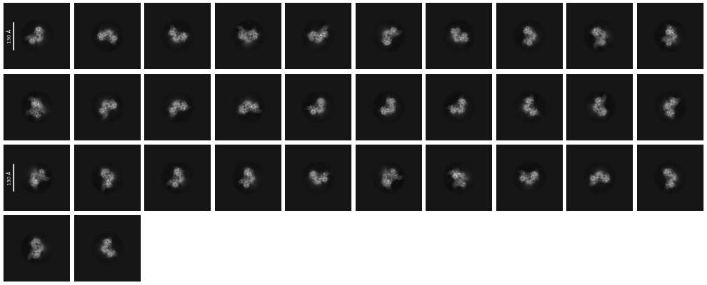 In total, around 19,000 movies were collected, and approximately 1.5 billion particles were picked using Topaz Train, resulting in the 2D classes shown below. The 2D classes appear to show secondary structure details, but also indicate a preferential orientation of the particles.