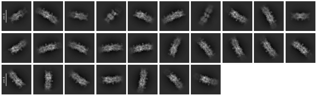 I have a dataset where my complex is about 150 Å wide and 250 Å tall. In many micrographs the particles appear stacked end to end. I routinely see single particles but also stacks of two, three, four, five or six particles. These are not true filaments and there is no helical symmetry. They are simply several copies of the particle sitting on top of one another.