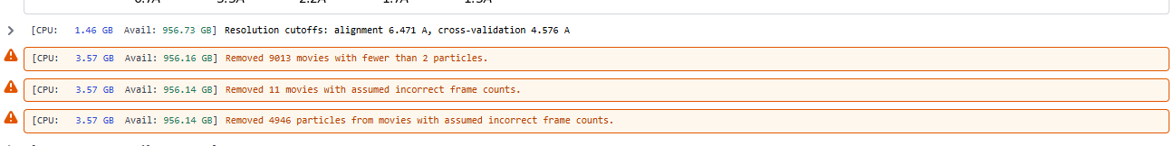 Hi, I need help as well. I have been encountering a similar problem, where RBMC will throw out particles and movies with assumed incorrect frame rate. It discarded 11 movies but ~5k particles from 11 movies, which is kind of impossible given that the average is 4 per micrograph. I saw this thread and tried what Martin did i.e. reassign particles, but it still throws out the particle. Can you please advise what to do? Also, is there a way to still add those micrographs where it says are less than 2 particles, i.e., with 1 particle >.<?
