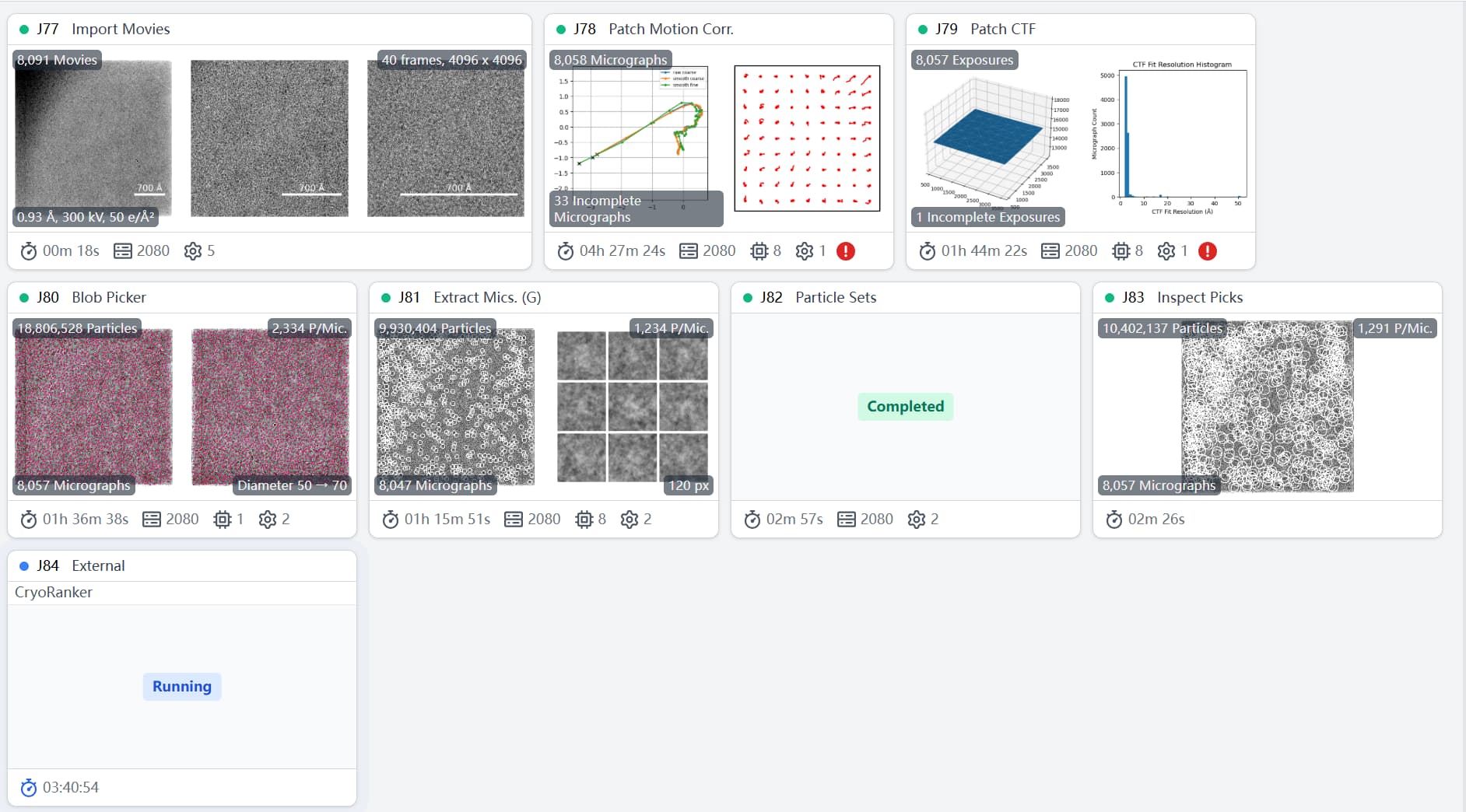 The Blob Picker job found 18.8 M particles; I kept 10 M after running the Inspect Picks job.