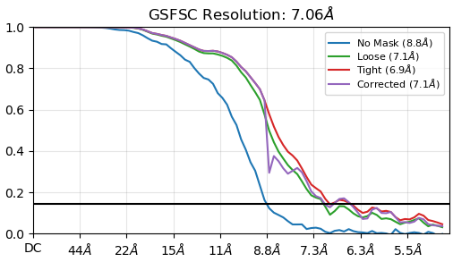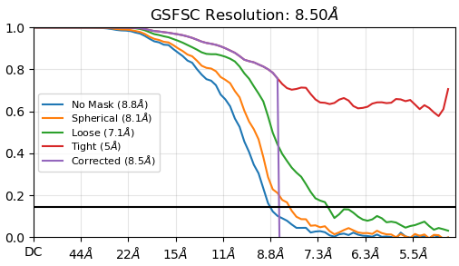 I am assisting a user in processing a medium-resolution data set who sees a very sharp dropoff in the corrected FSC curve around 8.5 A in the non-autotightened curve, although the autotightened curve looks (mostly) fine. It shows up more prominently in non-uniform refinement, but does show up in homogeneous refinement as well. The tight mask appears to be too tight as it does not approach zero.