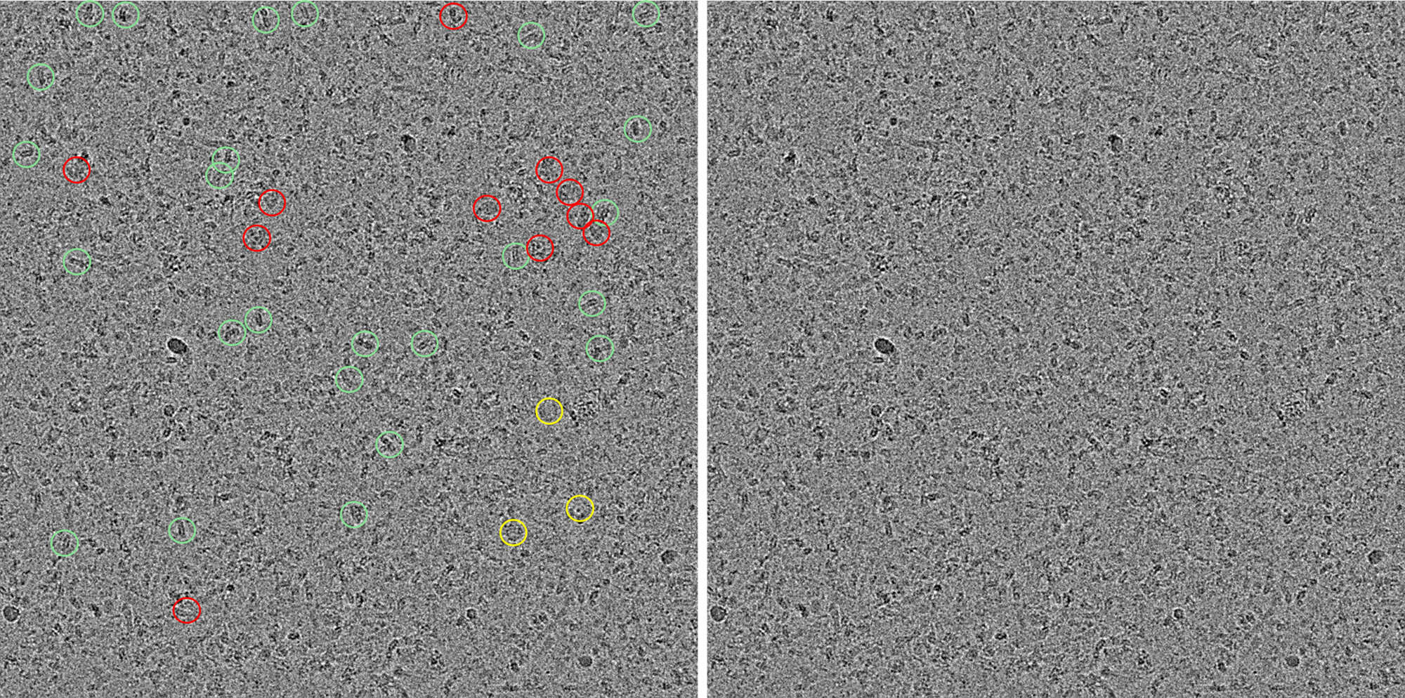Looks like picking many things that are much too small. GPCRs with 7 TMs, even single TM proteins that dimerize in the cytosol have 10nm diameter transmembrane region when you factor in the detergent belts, usually ~3nm of belt on each side. Such i see a lot of small things that aren’t likely desired. There are some nice interesting looking particles: 1) green - the side views for the ~10nm are easy to pick out, there are many things that look like side views that are much smaller that i wouldn’t use 2) yellow - this looks like a nice top/bottom view that has expected contrast with the size desired 3) red - these look interesting are about the expected size. With the current info these are the particles to go after, ideally after picking/inspect jobs these make up no less then 1/5 of the total particles that are being extracted and sent to 2D classification.