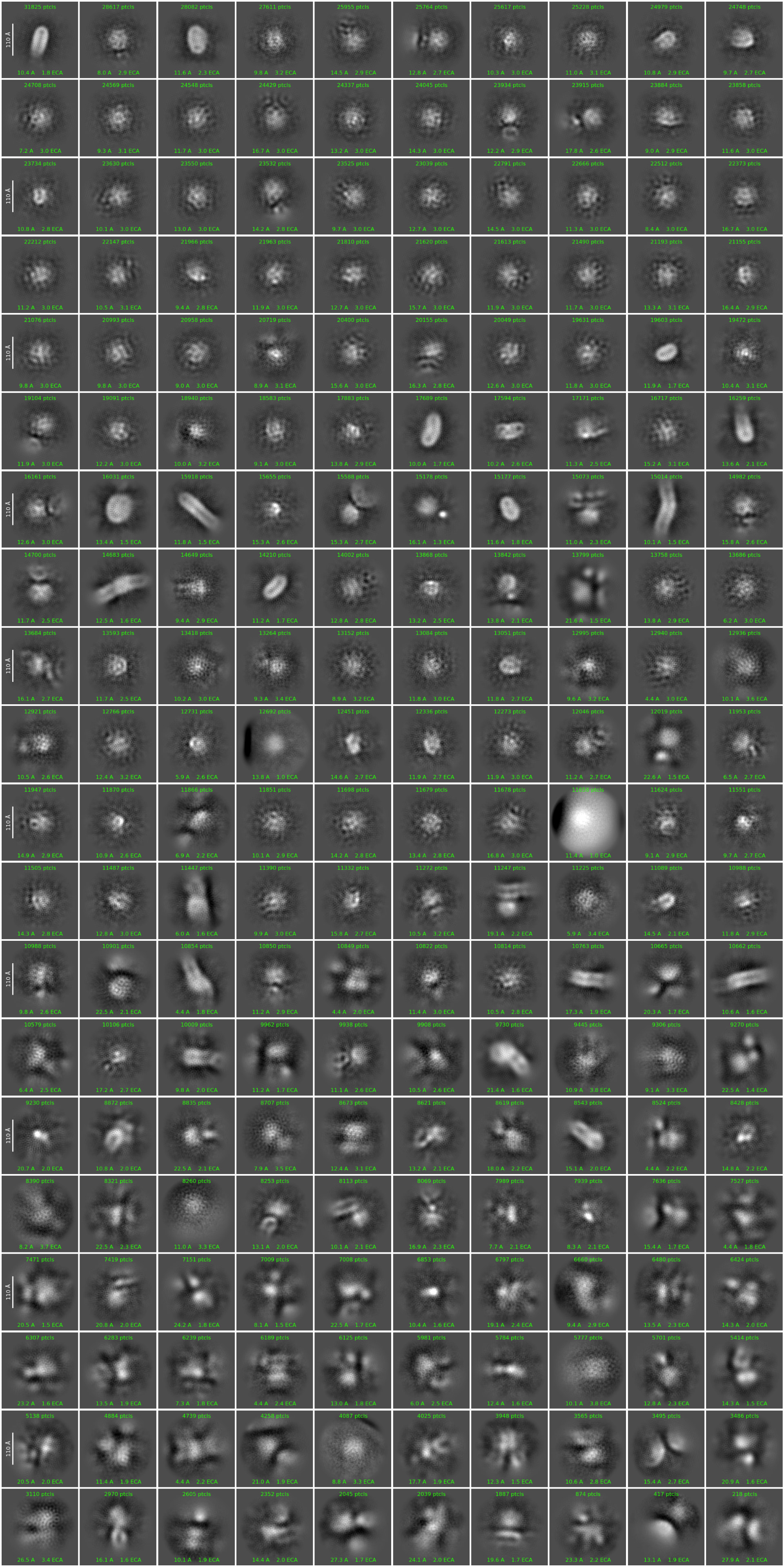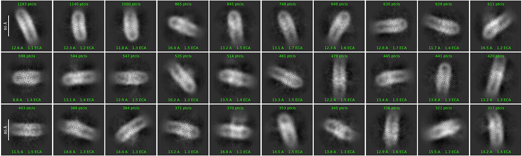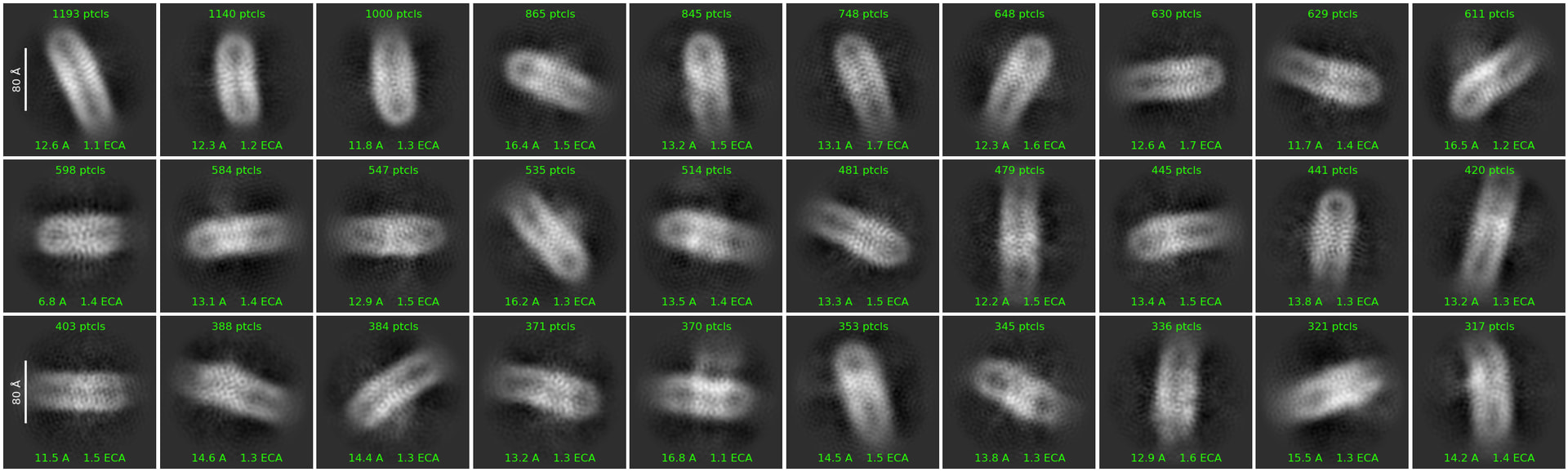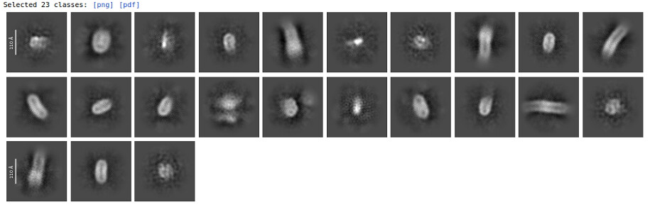 Your second round of 2d classification i’m only seeing side views, no top views or tilted. Side views always the easiest to pick as you get the contrast from the whole detergent belt. This goes back to the micrographs, do you have the contrast to see top/bottom views? The size of the belt suggest the 30,153 particles 2D group may have some top views but not seeing any in this second round of 2d. Top views can be harder, the belt isn’t always perfectly circular and can be odd shaped making it harder to align them up.