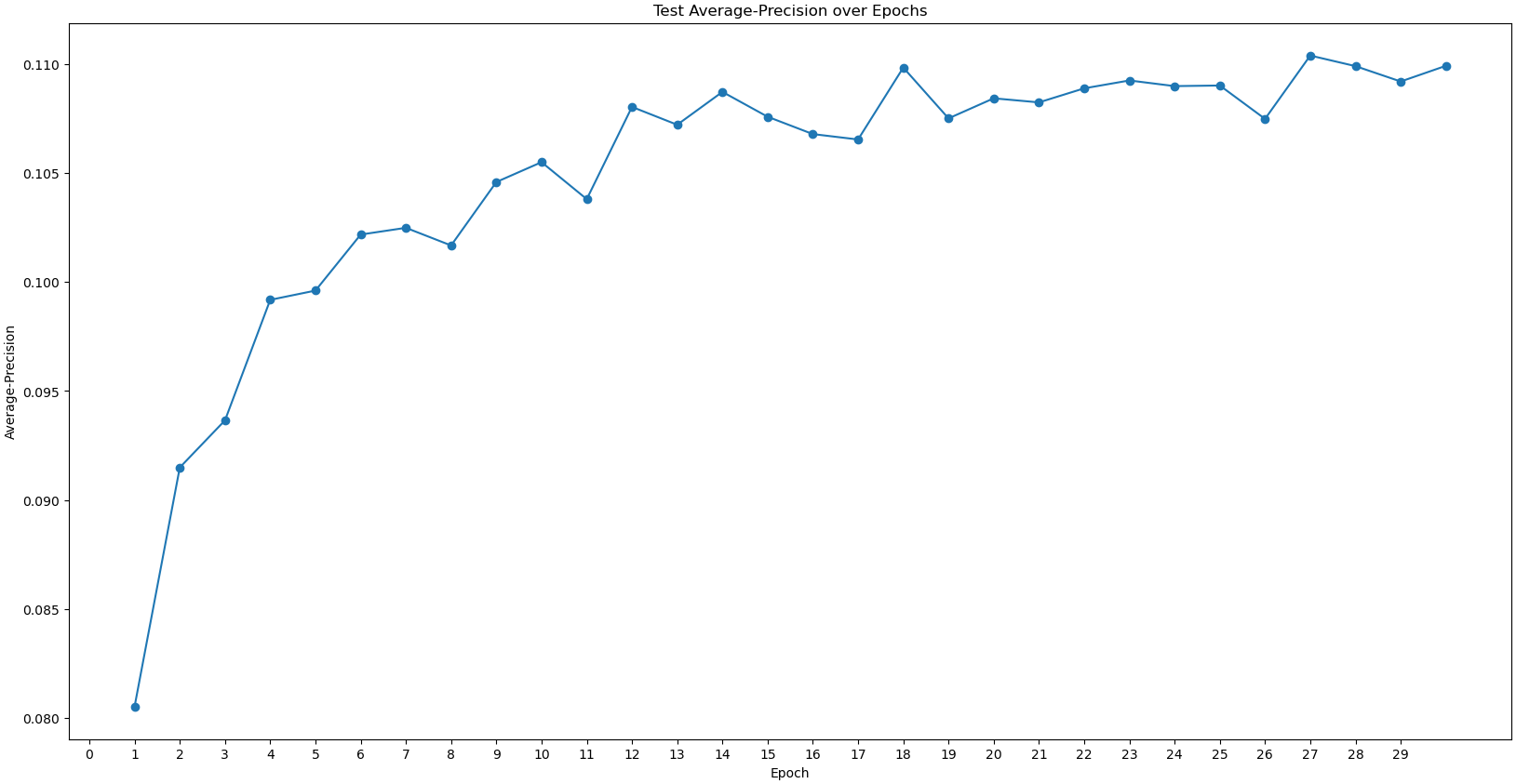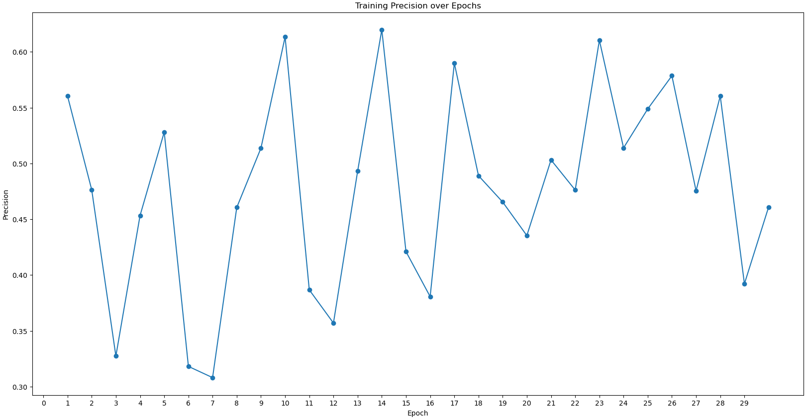 The precision curve oscillates over the epochs while the AuPrc seems to reach a plateau.