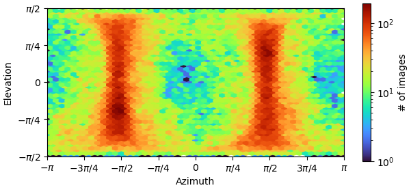Looks almost as if the Z-axis lies along the plane of your hydrophobic belt, and the half π-radian (±90°) bands correspond to a healthy distribution of “side”-views, with equal probability of aligning with a ±rotation. If so, this flavour of orientation distribution is actually conducive for reconstructing membrane proteins.