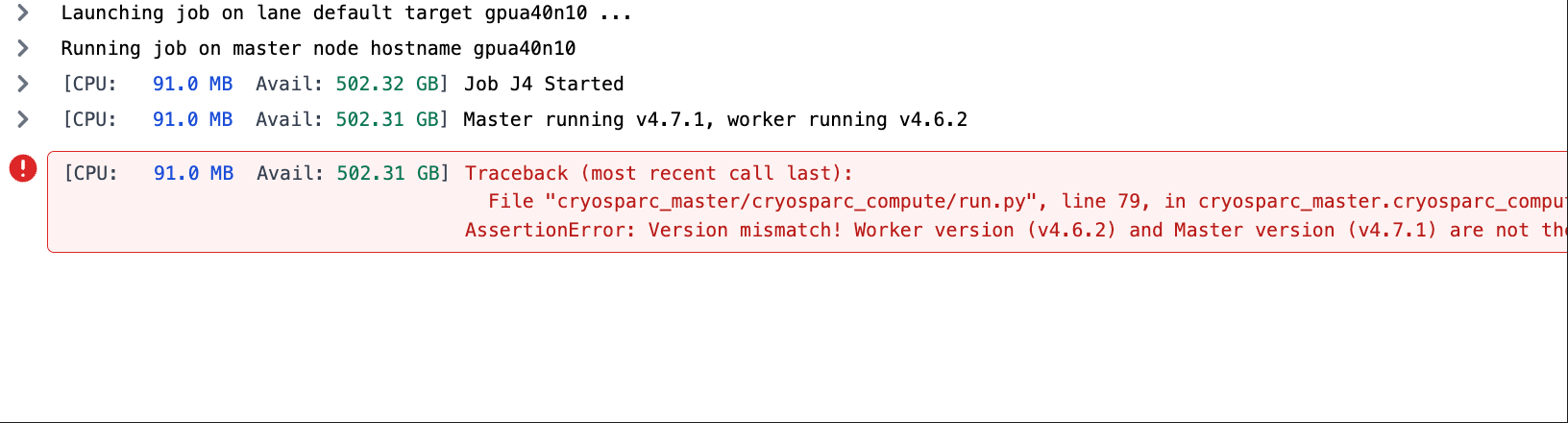 command, the software inside cryosparc_master/ gets updated, but the update of cryosparc_worker/ for some reason did not happen (automatically).